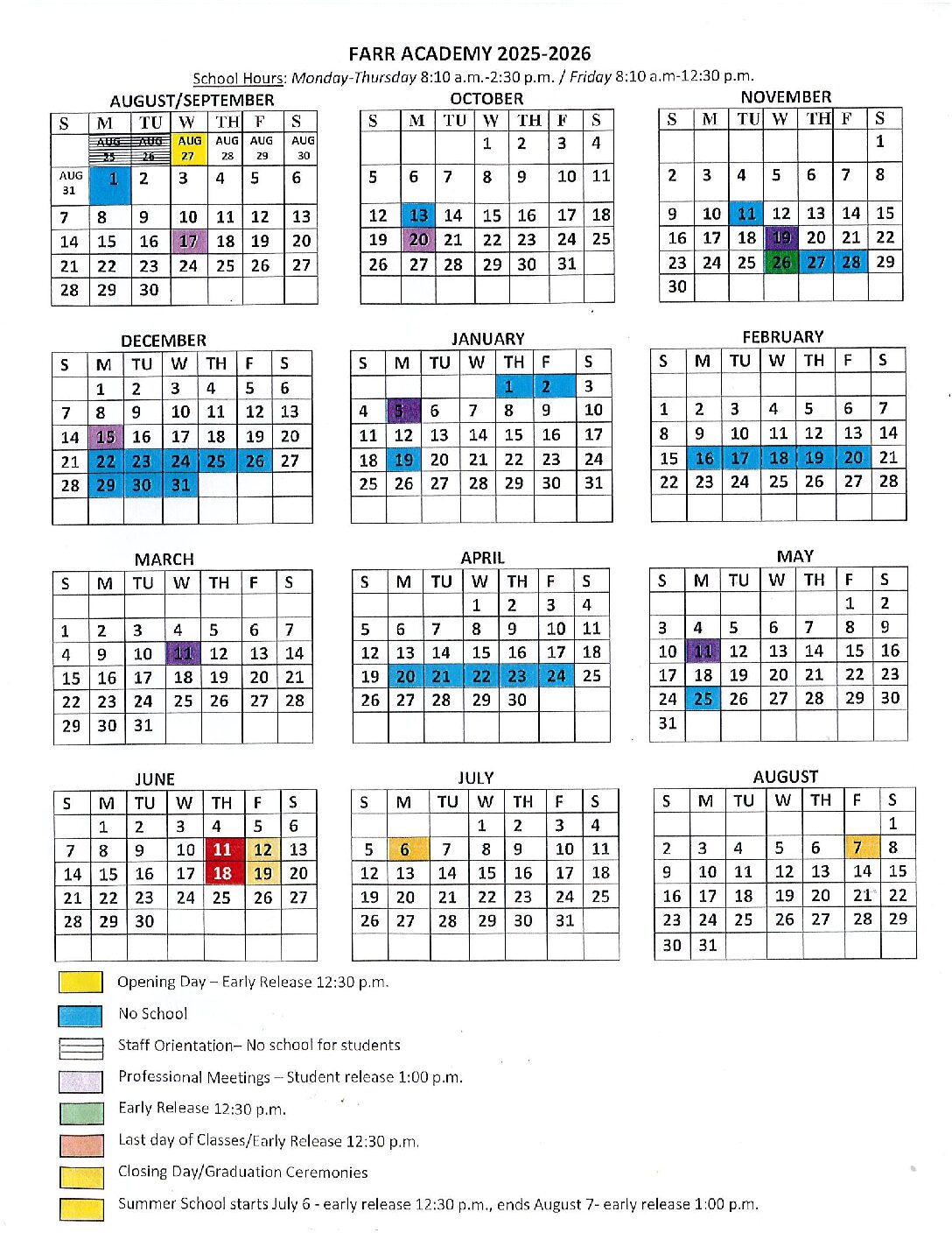 To download and print the calendar, click here: 2025-2026 Farr Academy School Calendar